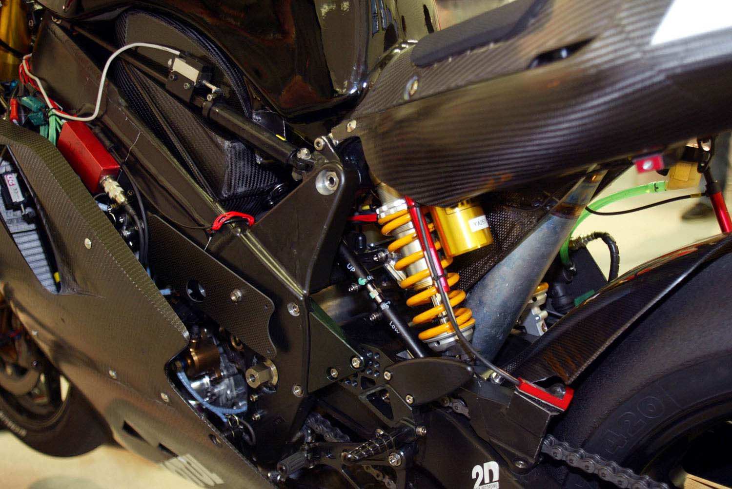 Bien que l’échappement sous la selle offre peu d’avantages en termes de puissance, le principal avantage du système remodelé permet aux ingénieurs du châssis de disposer de plus d’espace pour développer le bras oscillant arrière, en parallèle des modifications apportées au châssis du YZR-M1 de l’époque. Doté de deux unités d’amortissement principales fixés dessus de la poutre principale, ce concept explore les caractéristiques de flexion du cadre en alliage et visait à améliorer les sensations du pilote, notamment sur les angles d’inclinaison élevés.