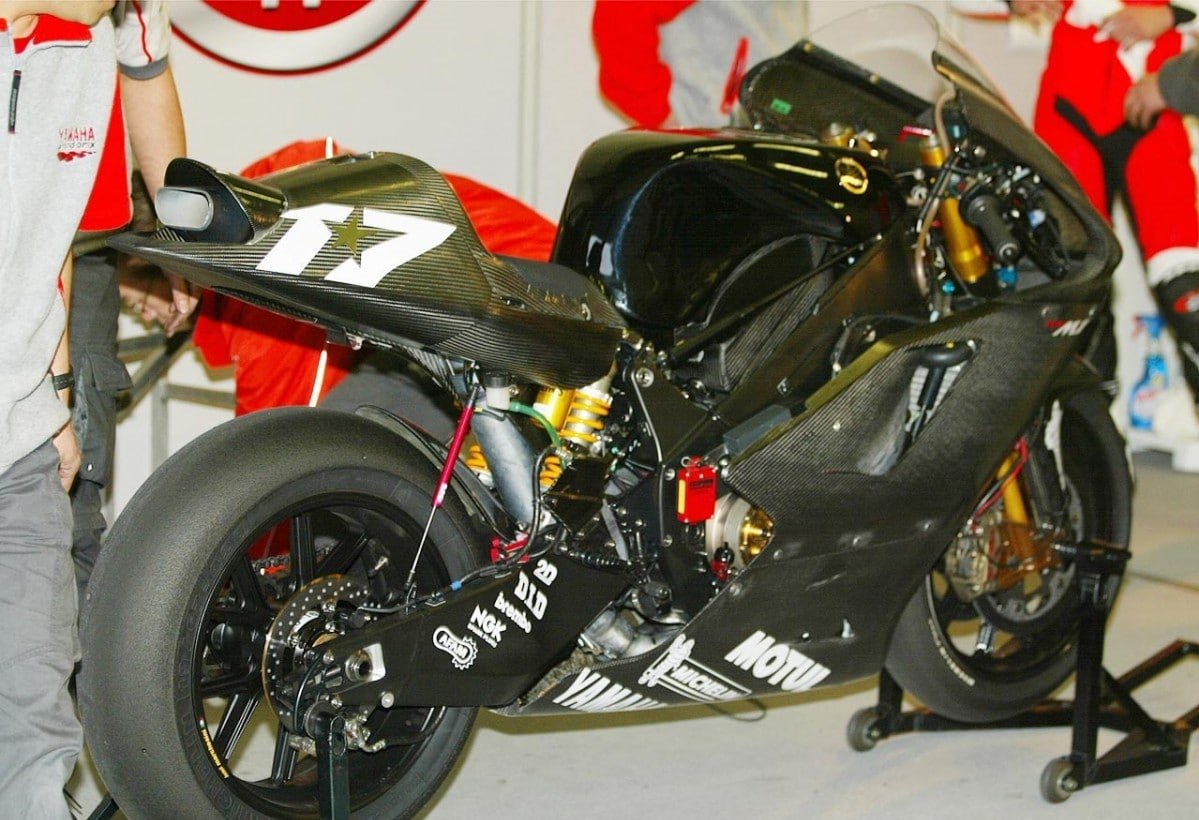 Ce prototype de la Yamaha YZR-M1 comprend un système de suspension arrière unique à double amortisseur Öhlins, un échappement quatre-en-un sous la selle, un bras oscillant arrière inversé et un châssis Deltabox expérimental. Il a été aperçu en piste en 2003, lors des essais IRTA à Jerez. L’objectif était d’améliorer le contact des pneus avec la surface de la piste et d’allonger leur durée de vie tout en réduisant le chattering.