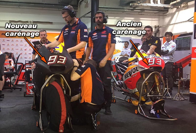 Mais aujourd’hui, Marc Márquez a utilisé un nouveau carénage dont la principale différence concerne a priori une nouvelle fois la prise d’air, beaucoup plus grande que sur son modèle 2016.