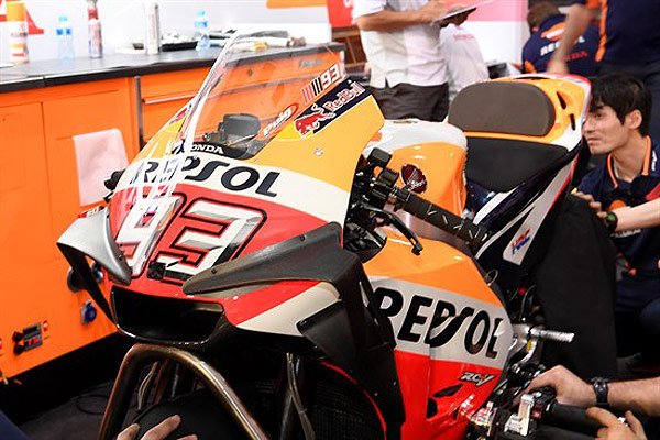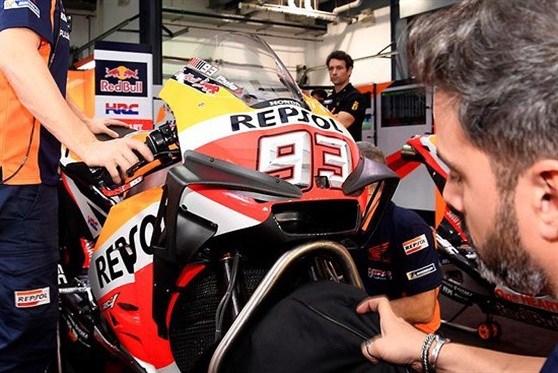 Aujourd’hui, la firme de Tokyo a testé une nouvelle configuration sur la moto de Marc Marquez, combinant les discrets déflecteurs latéraux déjà utilisés l’année dernière (gros pour Márquez, petits pour Pedrosa) et les ailerons aperçus à Buriram.