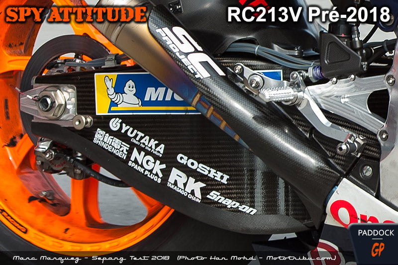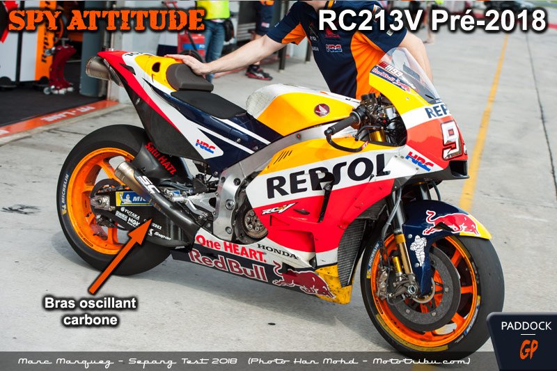 Est-ce la raison pour laquelle Honda s’intéresse maintenant à cette technique ? Nul ne le sait, mais toujours est-il que le bras oscillant en carbone que nous avions aperçu sur la RC213V de Marc Márquez lors des tests à Valence (voir ici) n’a pas été relégué aux oubliettes, loin de là, mais à nouveau essayé lors des derniers tests à Sepang.