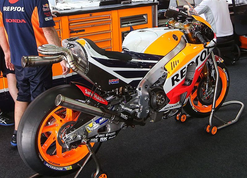 Lors des derniers tests à Sepang est apparu, d’abord sur la machine d’Aoyama puis sur celles de Marc Marquez et Dani Pedrosa, un échappement rallongé pour les cylindres avant.