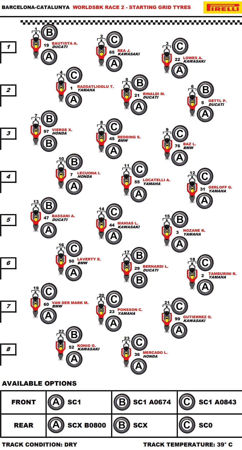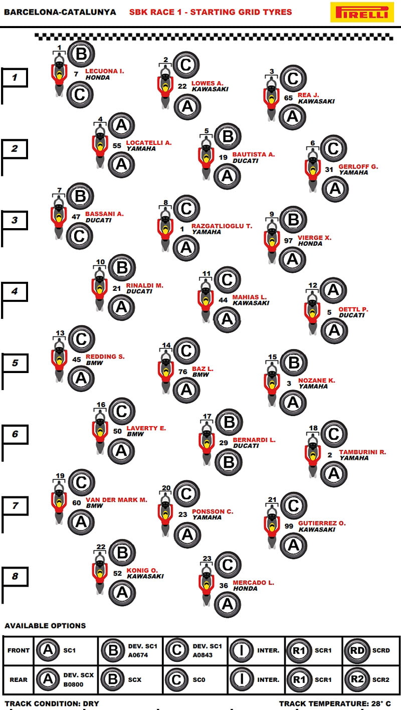 Tout comme en MotoGP avec les trois sortes de pneus proposés à l’avant et à l’arrière par Michelin, les concurrents du Championnat du monde WorldSBK se doivent de faire le bon choix de pneus Pirelli en Superbike.