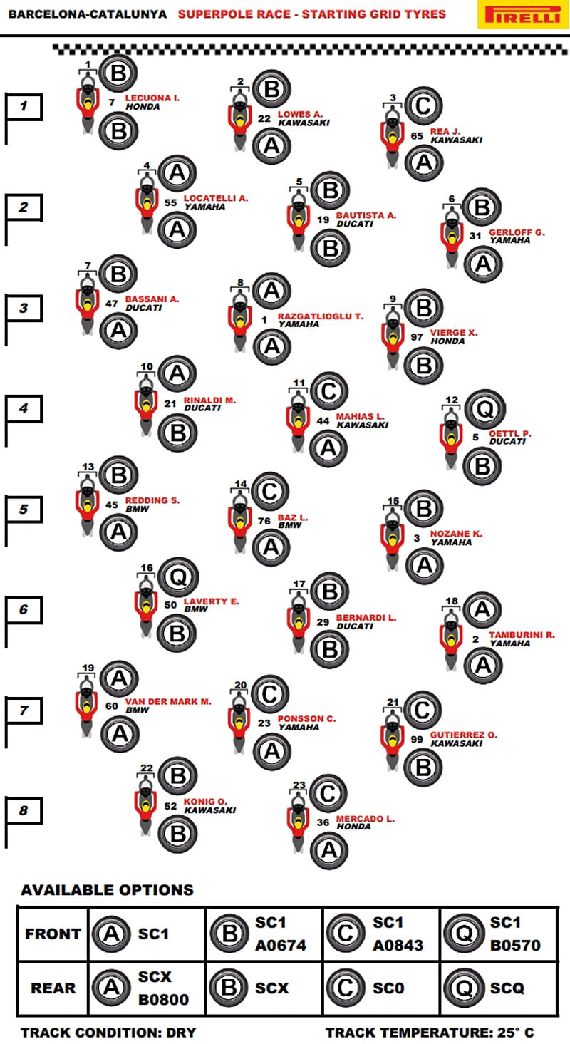 À l’exception des solutions arrière SC0 et SCQ, tous les pneus Pirelli ont été utilisés dans la course Superpole. A l’arrière, le pneu de développement SCX B0800 est resté, comme il l’était dans la Course 1 hier, le pneu le plus choisi sur la grille de départ. Cependant, plusieurs pilotes, dont le vainqueur de la course Álvaro Bautista (Aruba.It Racing – Ducati), le poleman Iker Lecuona (Team HRC) et Philipp Öttl (Team Goeleven), ont décidé d’utiliser le SC0 standard. Ce dernier qui, en terminant sixième, était également le meilleur des pilotes privés, était le seul, à part Eugene Laverty (Bonovo Action BMW), à choisir le SC1 B0570 à l’avant. Le choix du pneu avant était une fois de plus subjectif et pour cette raison, tous les pneus ont été utilisés, la solution de développement SC1 A0674 l’emportant légèrement. Après sa victoire dans la Course 1, l’Espagnol sur Ducati a remporté la Superpole Race devant les pilotes Kawasaki Jonathan Rea, deuxième, et Alex Lowes, troisième.