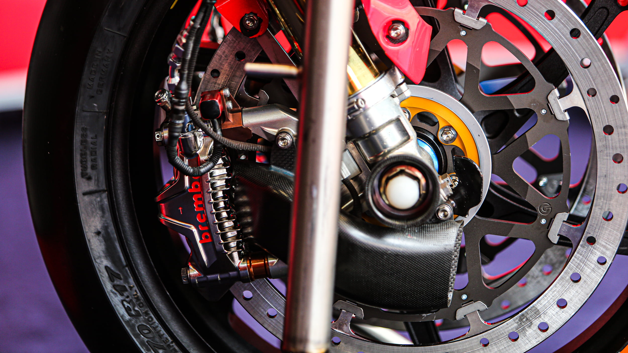 A l’instar de la Ducati de Scott Redding à Misano, les Honda étaient équipées du nouvel étrier de frein dont le design n’est pas sans rappeler le GP4, utilisé en MotoGP depuis l’an dernier. Afin de garantir au mieux son refroidissement, une écope en carbone dirige le flux d’air frais sur celui-ci.