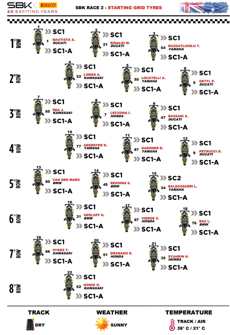 • Dans la Course 2, pratiquement tous les pilotes ont confirmé leur choix de pneu avant, donc le SC1 standard, à l’exception de Lorenzo Baldassarri (GMT94 Yamaha) qui a préféré le SC2 dur. A l’arrière, tous les pilotes ont choisi d’utiliser le SC1-A (pneu de développement médium en spécification A1126) qui avait prouvé vendredi qu’il offrait une meilleure adhérence que le SC1-B.