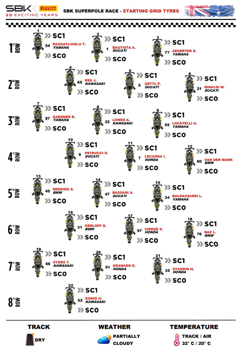 • Álvaro Bautista (Aruba.It Racing – Ducati) a remporté la Superpole Race après être parti de la deuxième place sur la grille. L’Espagnol est resté en tête du premier tour jusqu’à la fin. Derrière lui, son coéquipier Michael Ruben Rinaldi (Aruba.It Racing – Ducati) et, sur la dernière marche du podium, Toprak Razgatlioğlu (Pata Yamaha Prometeon WorldSBK). Le tour le plus rapide de la course est revenu à Dominique Aegerter (GYTR GRT Yamaha WorldSBK Team) avec un temps de 1’30.374 au deuxième tour.