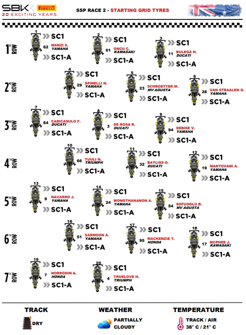 • La course a été interrompue au 14ème tour en raison de la présence d’oies sur la piste. À ce moment-là, Nicolò Bulega (Aruba Racing WorldSSP Team) était en tête de la course, il a donc été déclaré vainqueur. Le pilote Ducati a dominé la course depuis le départ jusqu’au dixième tour, lorsqu’il a momentanément cédé la tête à Stefano Manzi (Ten Kate Racing Yamaha), qui a terminé deuxième après avoir mené pendant deux tours avant de céder sa place à Nicolò Bulega au 13ème tour. La troisième place est revenue au pilote turc Can Öncü (Kawasaki Puccetti Racing).