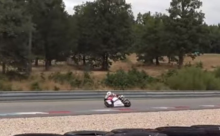Sur cette très courte vidéo des essais privés à Brno, nous avions bien entendu reconnu Marc Marquez (avec son casque noir et blanc réservé aux essais), puis une Moto2, puis John McPhee sur sa Honda Moto3. L’occasion également de comparer les bruits des 3 catégories…