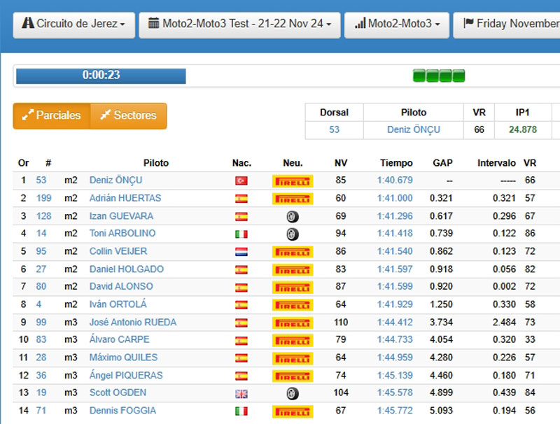 Au final, et après 85 tours du tracé de 4,4 kilomètres, c’est Deniz Öncü qui s’est avéré le plus rapide en établissant un chrono en 1’40.679. A titre comparatif, Fermin Aldeguer avait réalisé 1’40.307 lors du test officiel de février-mars 2024, puis la pole position en 1’40.673 fin avril.