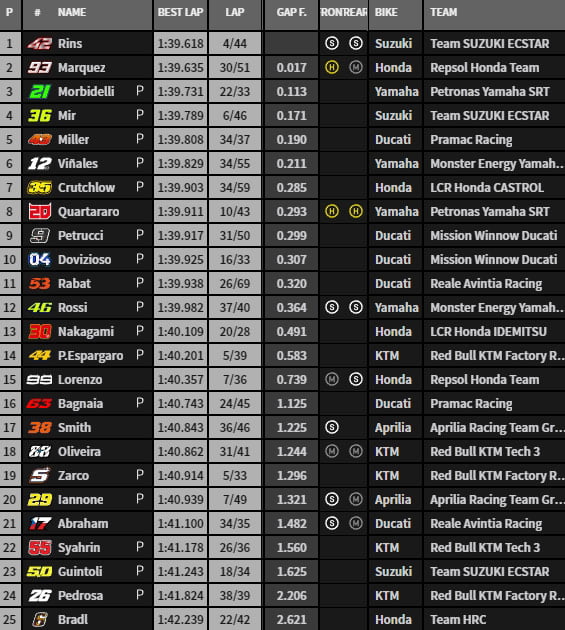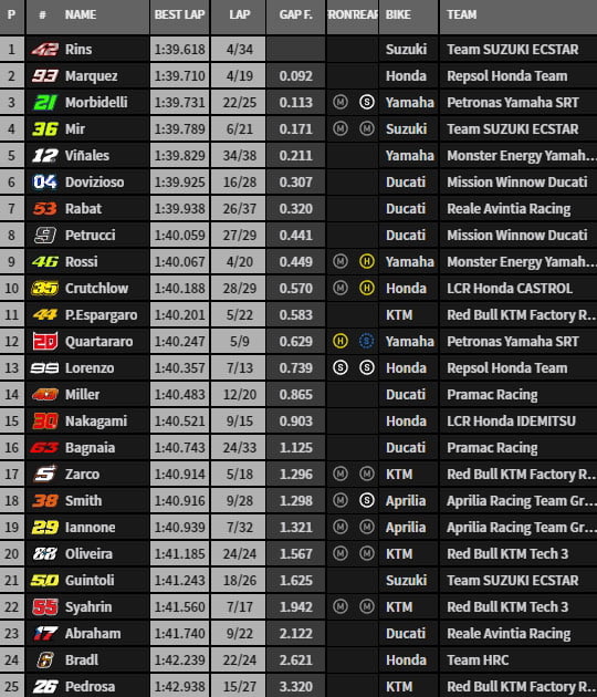 Le pilote Yamaha a ensuite poursuivi son effort en franchissant la barre des 1’40, tout comme Alex Rins qui a inscrit un 1’39.618 lors de son 4e tour lancé avec un nouveau châssis. Une nouvelle aérodynamique devrait également bientôt arriver…