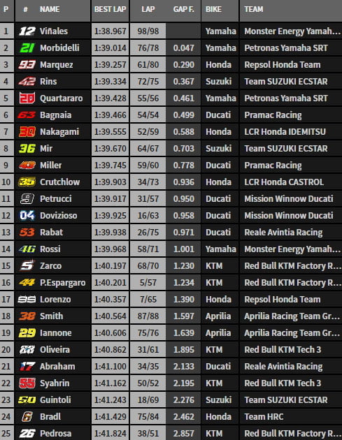 Une minute avant la fermeture de la piste, Franco Morbidelli prenait toutefois l’avantage en 1’39.014 mais c’était sans compter la détermination du numéro 12, très remonté après l’incident d’hier, qui franchissait la barre des 1’39 à l’ultime instant et réalisait 1’38.967.