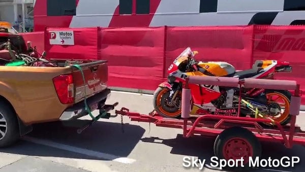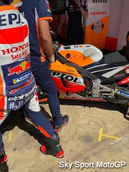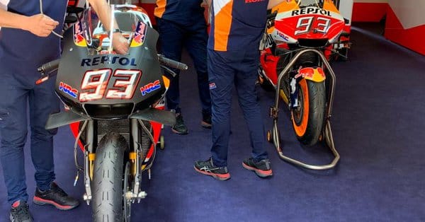 Marc Márquez dispose de 3 machines, deux aux couleurs Repsol, une semblant constituée d’un mixte 2018/2019, partiellement aux couleurs LCR.