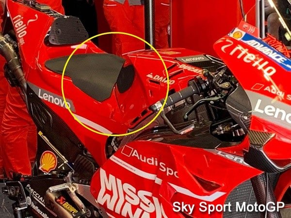 Chez Ducati, on a fait feu de tout bois avec un nouveau cache -réservoir échancré pour Danilo Petrucci, un peu dans le style de celui que Jorge Lorenzo a ramené du Japon.