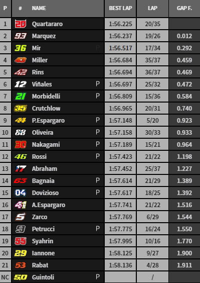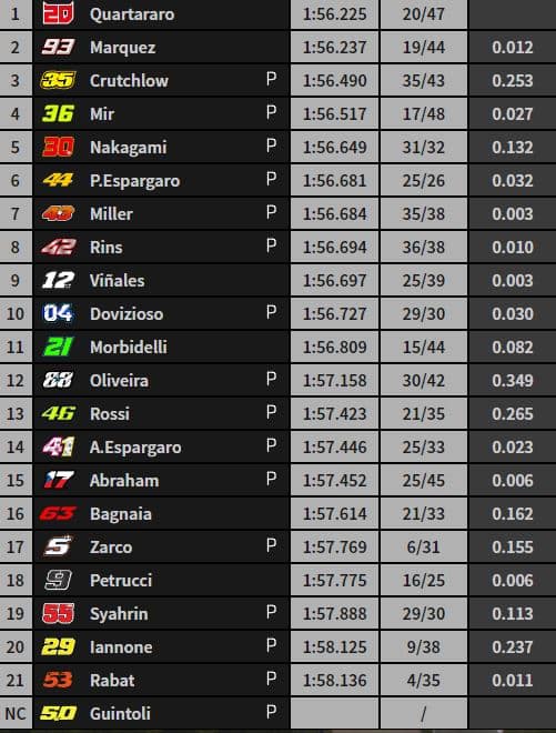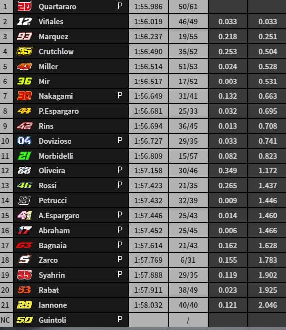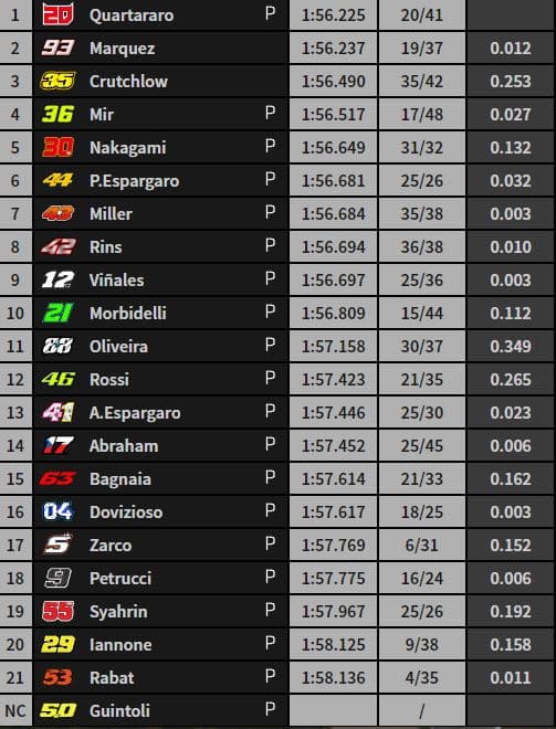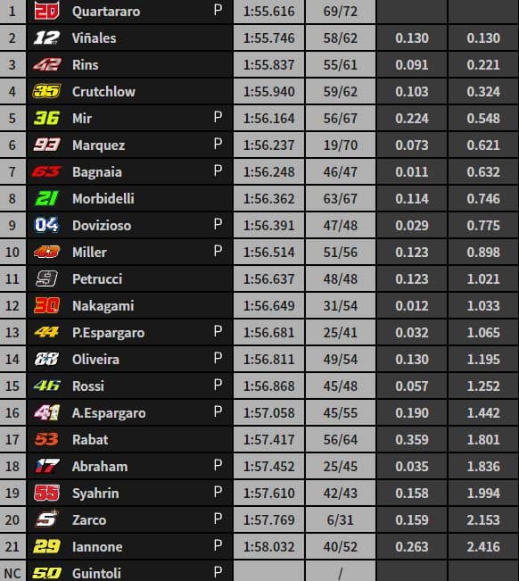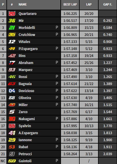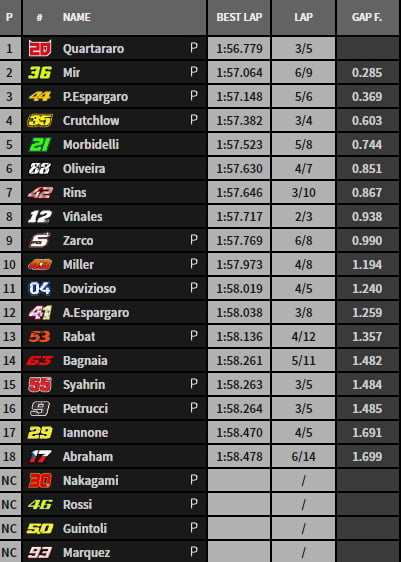 En 1’56.779, Fabio Quartararo établit la première référence provisoire devant Joan Mir, Pol Espargaro, Aleix Espargaro et Johann Zarco. Pour rappel, « El Diablo » avait dirigé la FP2 en 1’55.802.