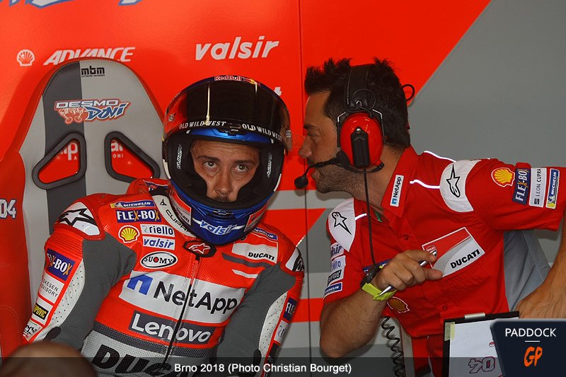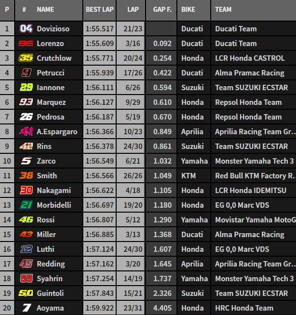 Derrière Jorge Lorenzo, Danilo Petrucci progressait tour après tour jusqu’à s’approcher à 1 dixième du meilleur temps du pilote majorquin, et les deux hommes menaient de concert le classement quand, à midi, Cal Crutchlow réussissait intercaler sa Honda entre les 2 Ducati « usine ».