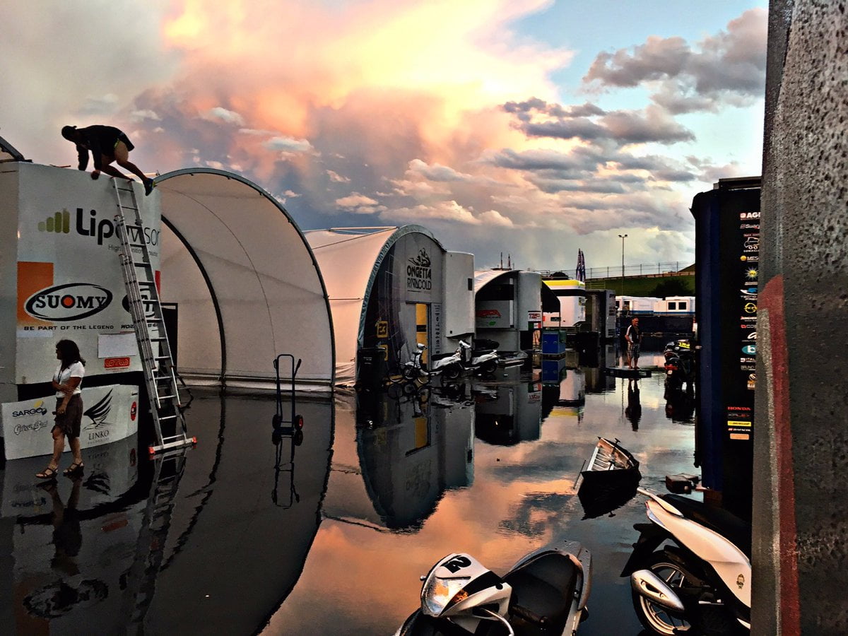 Si la météo a été particulièrement clémente avec les trois courses de dimanche dernier en Autriche, elle s’est vite rappelée au bon souvenir des équipes en inondant le paddock dimanche en fin d’après-midi, puis en écourtant de fait les séances d’essais officiels Moto2 et Moto3 de cette unique journée de test, le lundi  en début d’après-midi.