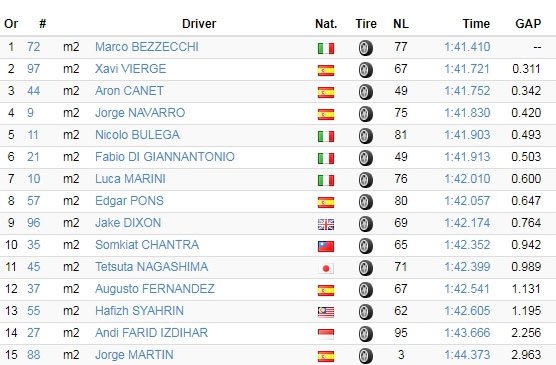Xavi Vierge (Petronas Sprinta Racing) et Arón Canet (Aspar team) se départageaient à coups de centièmes tandis que Jorge Navarro (Speed Up Racing) et Nicolò Bulega (Sky Racing Team VR46) complétaient le Top 5.