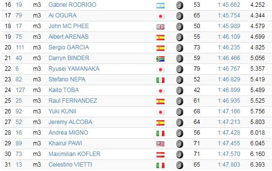 John McPhee (Petronas Sprinta Racing), Albert Arenas (Aspar Team) et Sergio Garcia (Estrella Galicia 0,0), le leader de la veille, complètent un Top 5 auquel ils appartenaient déjà le premier jour.