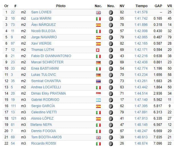 En Moto3, les machines ont été plus sensibles au souffle d’Éole mais l’Argentin Gabriel Rodrigo (Honda, Kommerling Gresini) a néanmoins pu légèrement descendre son chrono de 1’47.254 à 1’47.140 terminant ainsi officiellement premier des pilotes équipés d’un transpondeur.