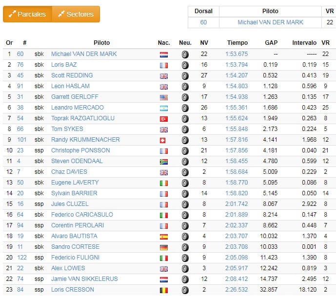 Une demi-heure plus tard, Sylvain Barrier (Brixx Performance Ducati) s’élançait le premier, suivi de Scott Redding (Ducati Aruba) et Michaël van der Mark (Yamaha Pata), ce dernier établissant une première référence en 2’12.453.