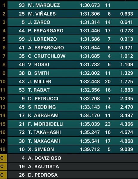 Johann Zarco s’emparait du meilleur temps en 1’31.368, soit plus vite que son meilleur temps en course de dimanche dernier, réalisé en 1’31.576. Il avait réalisé son chrono ce mardi matin avec sa Yamaha 2016. Au niveau de l’équipe d’usine Yamaha, Valentino Rossi disposait de 3 motos à comparer et Maverick Vinales de 4. Ils avaient également le nouveau moteur M1 à tester afin de le valider pour les essais de Sepang.