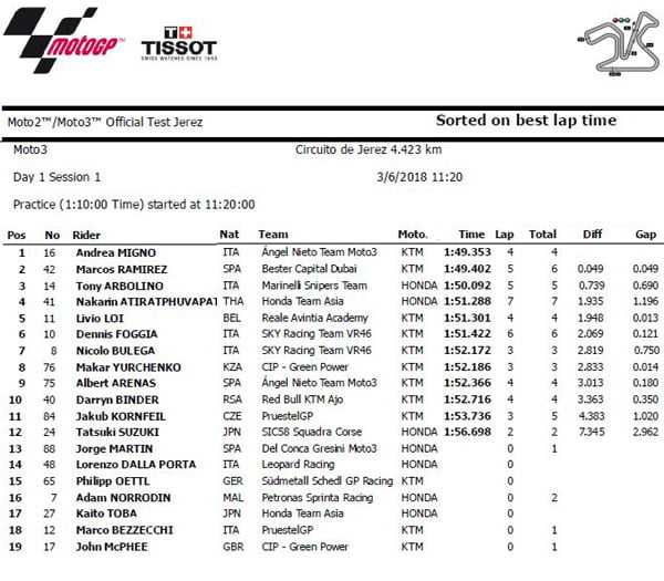 A dix minutes de la fin de la séance, douze pilotes sont sortis effectuer quelques tours sur piste mouillée. Andrea Migno (Ángel Nieto Team) termine en tête avec un chrono de 1’49.353, suivi de Marcos Ramirez (Bester Capital Dubai) et Tony Arbolino, mais il faudra attendre que la piste sèche pour avoir un classement significatif.