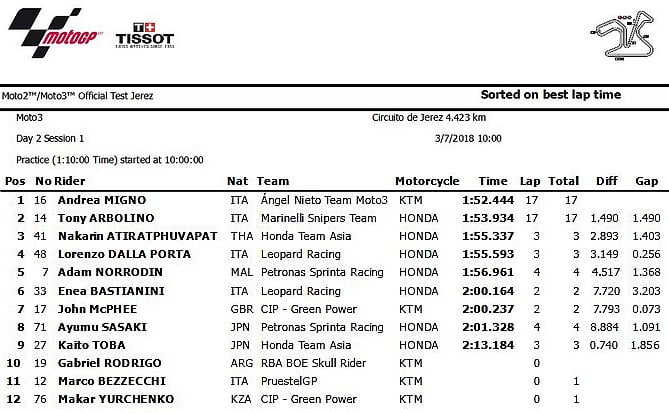 Néanmoins, Andrea Migno (Ángel Nieto Team) a été le plus téméraire et est sorti tourner pendant une vingtaine de minutes. Tony Arbolino (Marinelli Snipers Team) l’a imité en milieu de séance, et les deux pilotes ont finalement effectué dix-sept tours avec des chronos qui ne sont, bien évidemment, pas significatifs en raison des conditions de piste. Kaito Toba (Honda Team Asia) a réalisé trois tours en début de séance, mais est vite rentré au box pour ne plus ressortir.