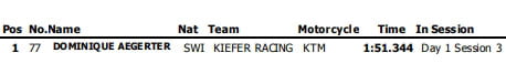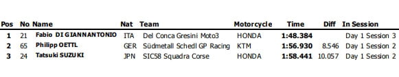 Un plus nombreux ont été les participants en Moto3 puisque outre Fabio Di Giannantonio qui a adopté l’attitude du pilote suisse en effectuant 10 et 21 tours en session 2 et 3 sur sa Honda du team gresini, avec un meilleur chrono de 1’48.384, Philipp Oettl (Sudmetal Schedl GP Racing) et Tatsuki Suzuki (SIC58 Squadra Corse) ont égalé réalisé quelques boucles lors de la deuxième session.