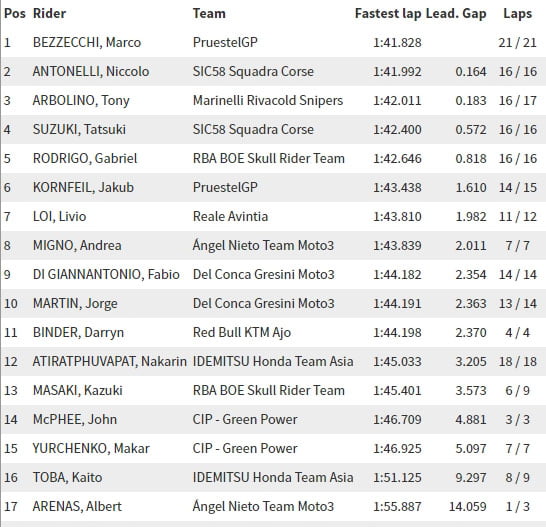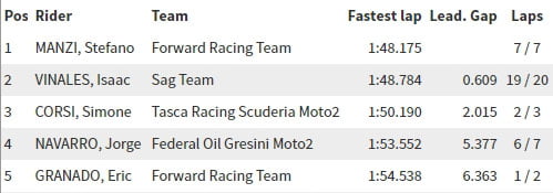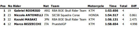 Les chose n’en restaient toutefois pas là puisque Tatsuki Suzuki (Honda, SIC58 Squadra Corse) et Marco Bezzecchi descendaient la référence provisoire en 1’42.237 à 15 minutes du drapeau à damier, avant que l’Italien de la VR46 Riders Academy claque un 1’41.828 dans les dernières secondes. Il est suivi par Niccolo Antonelli (Honda, SIC58 Squadra Corse) et Tony Arbolino (Honda, Marinelli Rivacold Snipers).