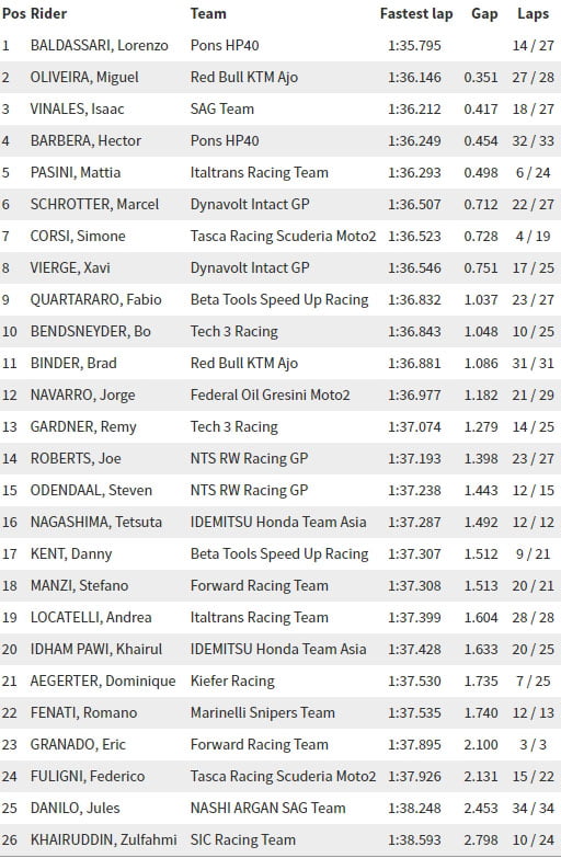 Lors de la dernière séance de la journée, ils furent nombreux à tenter d’améliorer le chrono du pilote Italtrans Racing Team, mais la piste commençait déjà à refroidir et Lorenzo Baldassarri échouait dans cette tentative pour seulement 2/100 de seconde. Derrière lui, on retrouve une fois de plus le très consistant Miguel Oliveira, un Isaac Vinales relativement inattendu et un Hector Barbera qui a parfaitement su augmenter son rythme lors de la deuxième partie de journée.