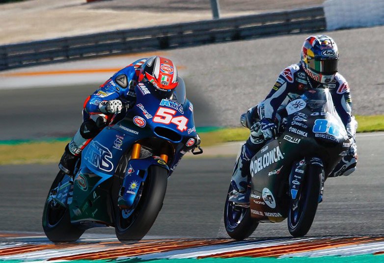 Après une session matinale où seul Mattia Pasini a effectué quatre tours à cause d’une piste frôlant les 0°, les pilotes Moto2 ont pu bénéficier d’une bonne séance en milieu de journée lors de laquelle le même Mattia Pasini inscrivait un très honorable 1’35.779, à moins d’une seconde du record de Johann Zarco en 1’34.879. Il était suivi à 1/10 par son compatriote Simone Corsi puis, 3/10 plus loin, par Miguel Oliveira (voir ici).