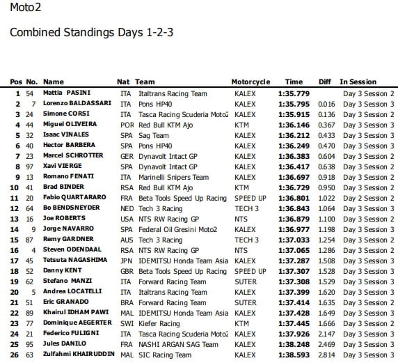 Au classement combiné des trois jours, le trio transalpin Pasini-Baldassarri-Corsi domine la scène devant Miguel Oliveira alors que Romano Fenati s’empare de l’honorifique titre de meilleur Rookie.