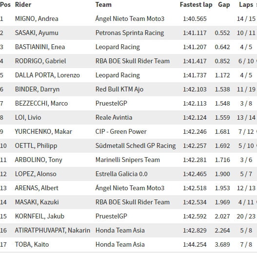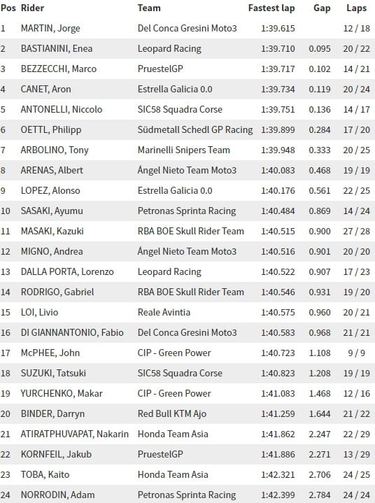 Celle-ci fut dominée par Jorge Martin, le recordman du circuit en 1’38.428. S’il n’était pas question d’aller le taquiner aujourd’hui, le pilote du team Del Conca Gresini a néanmoins réalisé un honorable 1:39.615 suffisant pour le mettre à l’abri des attaques d’Enea Bastianini (Leopard Racing) et du très en verve Marco Bezzecchi (Prüstel GP).