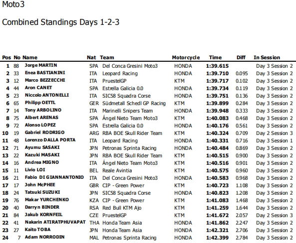 Les Moto3 clôturant cette dernière journée d’essais, les concurrents ont encore plus subi le refroidissement de la piste que leurs camarades de Moto2 et la quasi-totalité des chronos de référence ont été effectuée lors de la deuxième session.