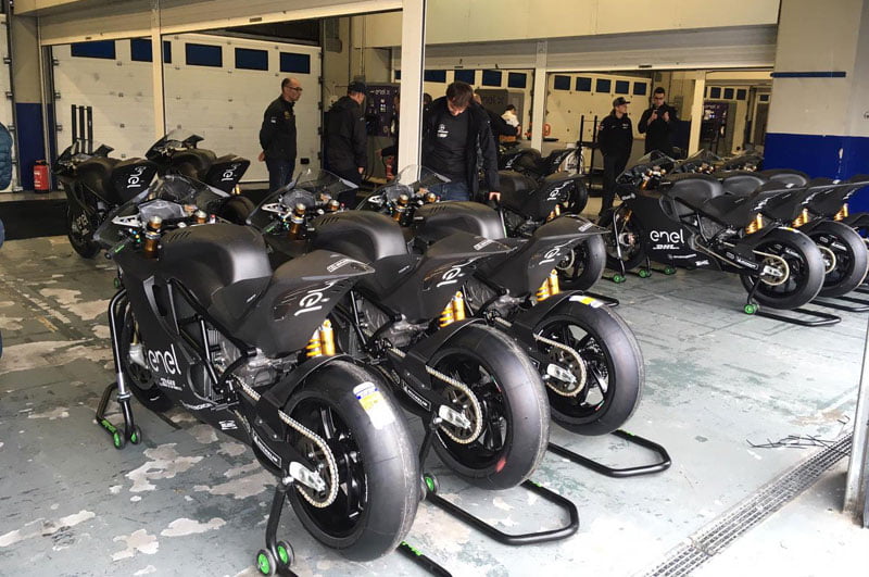En MotoE, la firme italienne Energica a livré 12 motos électriques Ego pour les 12 teams inscrits dans la formule électrique, alors que 18 pilotes participeront aux 5 courses que comportera la saison 2019 (voir ici). Comme nous l’avions annoncé, les motos sont pour le moment noires et numérotées de 1 à 12, suivant les teams. Les pneus Michelin sont spécifiques à la catégorie, mais dérivés du MotoGP pour l’avant (fortes contraintes dues au poids) et du Superbike pour l’arrière (puissance modérée). Il semble que, grâce à un chariot mobile, l’on s’oriente vers une recharge des batteries sur la grille de départ, après le tour de reconnaissance…