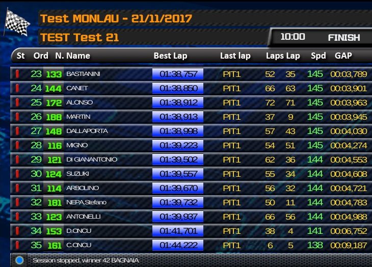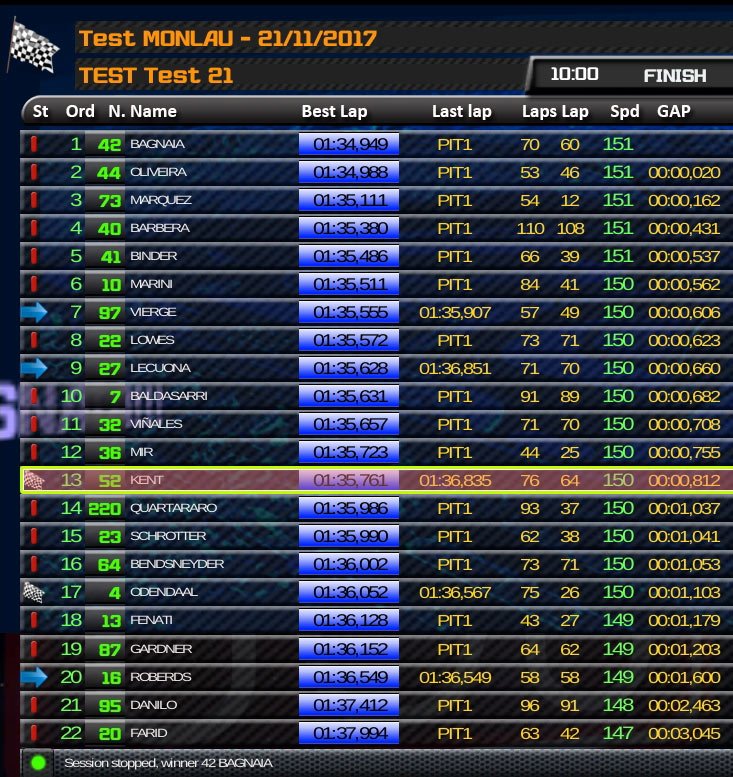 Mais le fait notable de la journée est la quatrième place d’Hector Barberá (Kalex Pons HP 40) qui semble s’être très vite adapté à la catégorie après huit ans passés en MotoGP. Barberá a bouclé un total de 110 tours sur la piste de Cheste, soit 440,5 kilomètres qui lui ont permis d’être le pilote ayant le plus roulé sur le circuit Ricardo Tormo lors de cette journée d’entraînement.