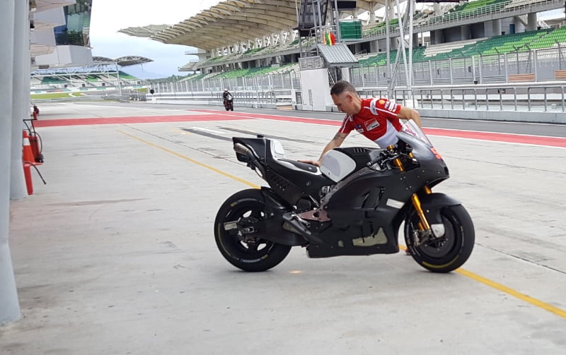 Les trois jours mis en place pour des tests privés se finissent à Sepang, tracé qui se prépare à présent à la rentrée du MotoGP pour des essais officiels qui commenceront le 30. Une préparation que l’on espère toute concentrée sur l’état d’une piste qui pâtit d’un nouvel enrobé qui refuse de sécher dès qu’une averse le mouille. Un écueil qui a fortement perturbé les travaux de ces trois derniers jours. Et pourtant, il y en avait des choses à valider, tant chez Ducat que chez Yamaha. Et même chez Honda.
