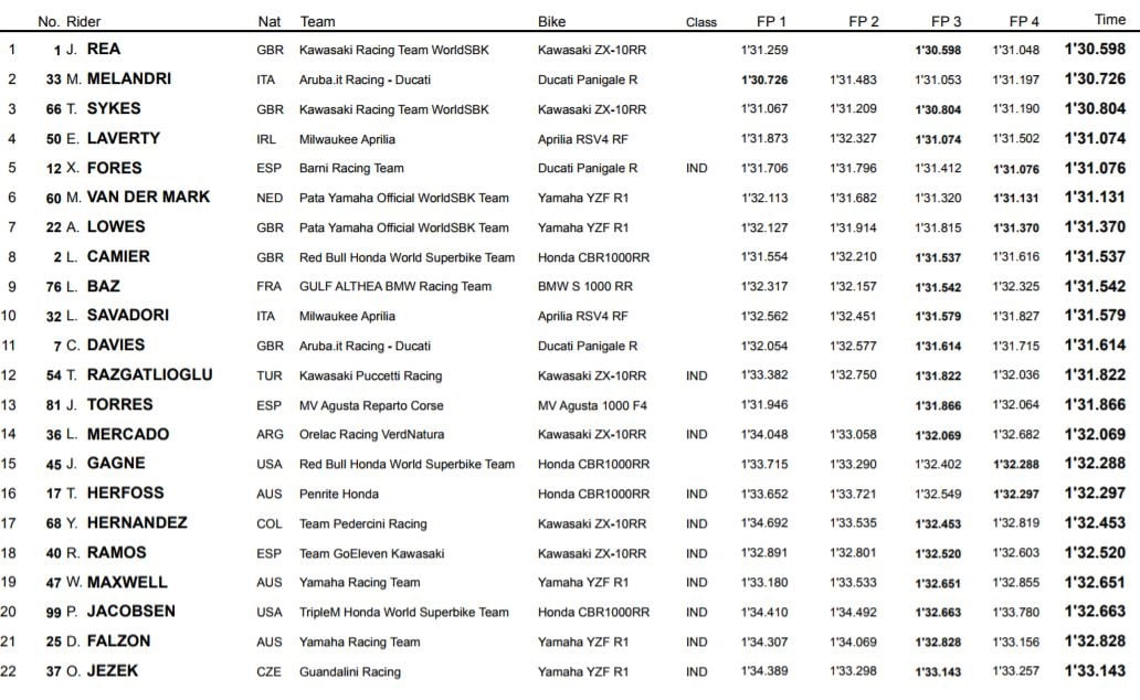 Comme la veille, Rea chutait sans gravité : « Lundi j’ai eu beaucoup de chance dans ma chute au viage 11, mes mécaniciens ont dû travailler jusqu’à minuit pour réparer la moto. Aujourd’hui, je suis tombé de nouveau – mais cette fois-ci seulement un glissement inoffensif. Je me sens bien sur la moto et j’ai toutes les raisons d’être confiant pour le week-end à venir. Lundi, je voulais forcer un peu, aujourd’hui je conduisais naturellement. Mon entraîneur, Fabien Foret, m’a beaucoup aidé »