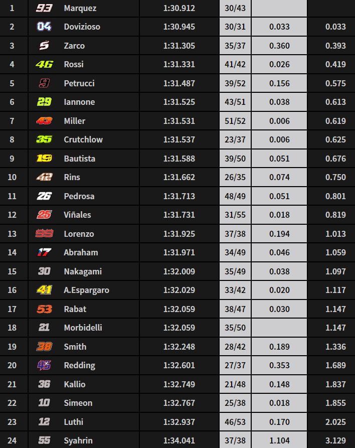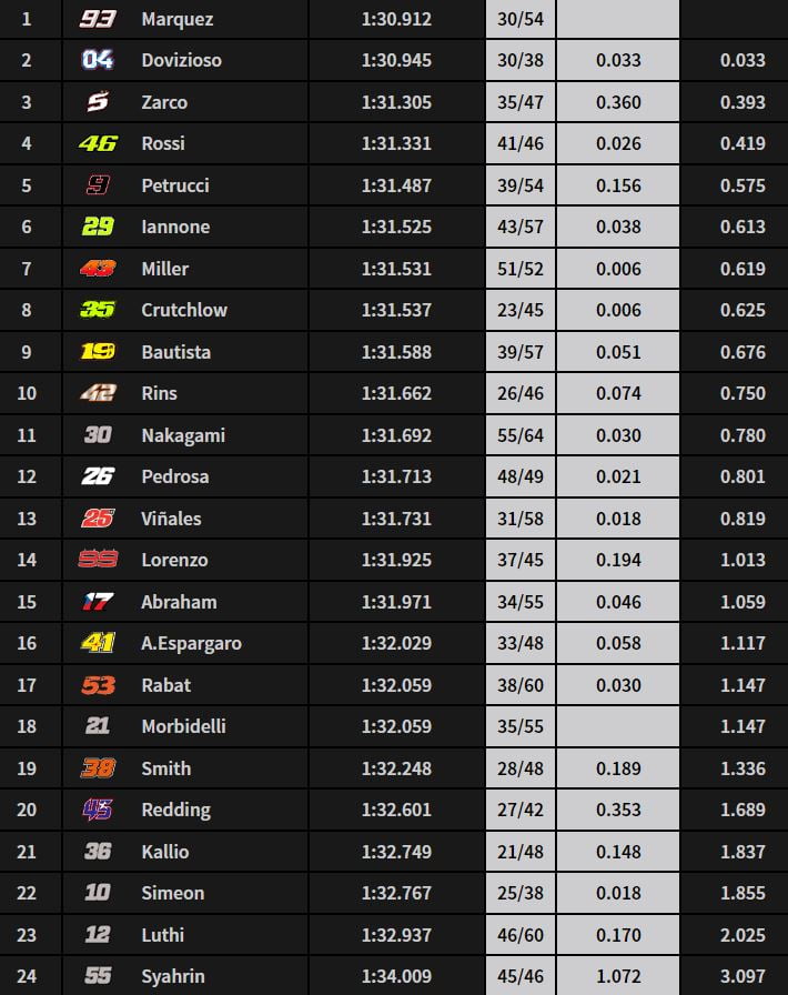 A 50 minutes de la fin, Jack Miller améliorait son chrono en 1’31.154 et s’emparait de la quatrième position à 0.242 de Marquez et 0.057 de Rins. Peu après, Andrea Iannone se rapprochait à 0.08 de lui.
