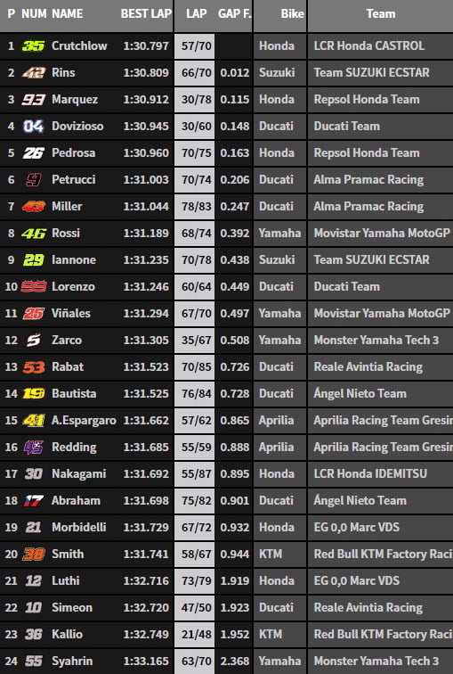 C’est avec un petit centième de seconde d’avance que le Britannique s’est imposé avec sa Honda de l’équipe LCR devant Alex Rins et sa Suzuki. Marc Marquez devançait pour la troisième position Andrea Dovizioso, tandis que Valentino Rossi se positionnait huitième et Johann Zarco douzième.