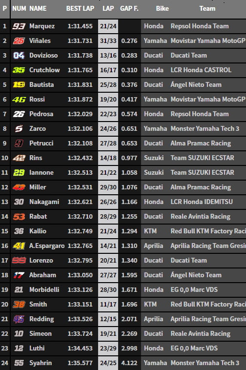 Maverick Vinales, qui a alors le pilote Honda en point de mire, en profite pour se positionner deuxième.