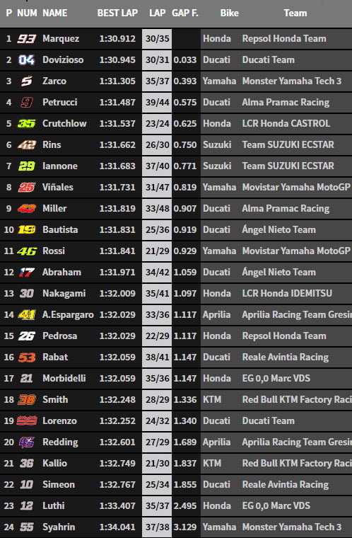 A six heures, heure française, Johann Zarco frappe un grand coup et se positionne second, à seulement 2/100 de seconde Andrea Dovizioso, puis le dépasse provisoirement pour 1 millième !