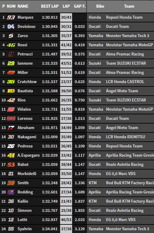 Même phénomène chez Yamaha où Valentino Rossi s’est placé 4e tandis que Maverick Vinales apparaît à la 16e place. Pendant ce temps, Danilo Petrucci effectue une simulation de course de 27 tours sans aucun problème de pneumatiques alors que l’épreuve elle-même en comptera un de moins.