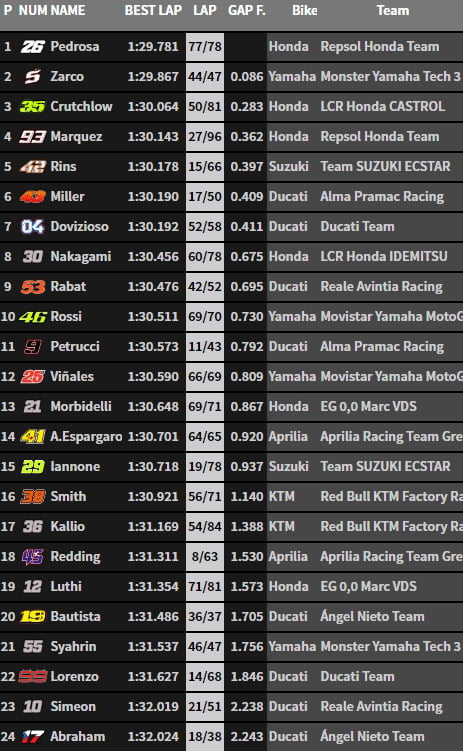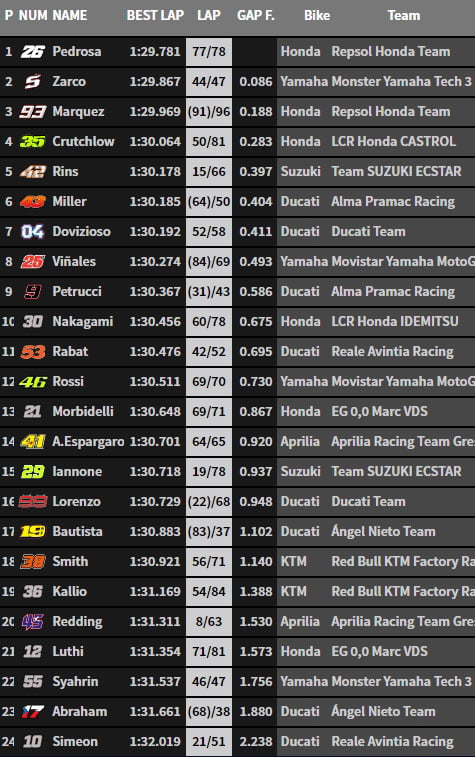 « Par exemple lors d’un test précédent à Phillip Island en Australie, nous n’avions pas trouvé de solution idéale en 2016. J’ai ensuite attaqué quand même, bien que blessé à la main et j’ai raté quelques courses… En attendant, j’ai appris ma leçon, je veux venir au Qatar en bonne santé parce que nous savons que je peux être très rapide au Qatar, nous pouvons maintenant nous battre pour les positions dans le top 6 ou le top 7. Mon rythme de course était très bon ici, surtout avec les pneus du GP d’Autriche. On ne doit pas oublier : j’ai fait mon meilleur temps avec un pneu avant que j’avais déjà utilisé pendant 35 tours… Honnêtement, je ne voulais pas gâcher notre travail à la fin avec une attaque risquée. »
