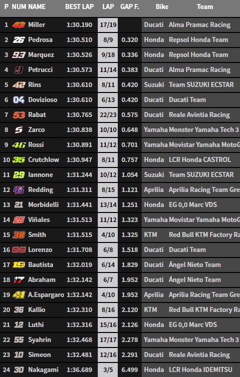 Peu avant l’issue de la première heure, Danilo Petrucci réussit à se hisser cinquième avant de prendre l’ascendant sur son compatriote Andrea Dovizioso pour s’emparer de la quatrième place. L’officiel Ducati se voit alors repoussé en sixième position devant Tito Rabat, Johann Zarco et Valentino Rossi.