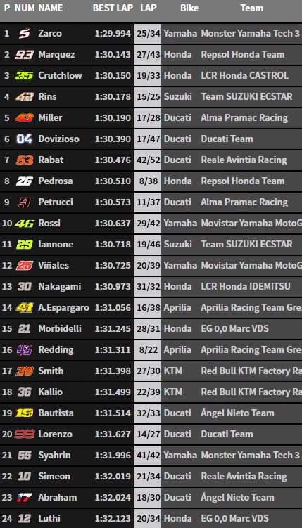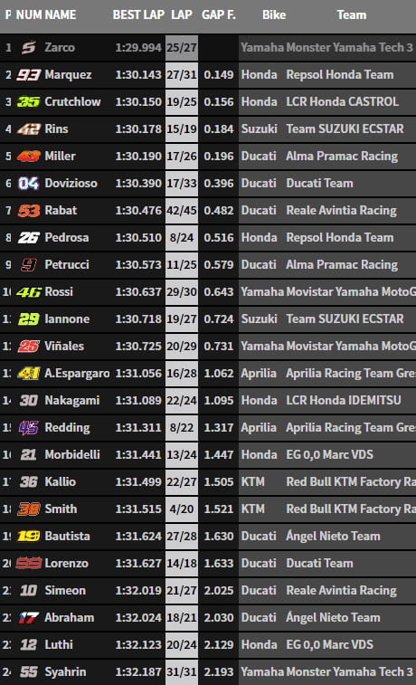 Alors que Johann Zarco bondit au classement en signant un nouveau temps de référence en 1’30.108, Valentino Rossi parvient à se placer la deuxième Yamaha en dixième position à près d’une demi-seconde de la Honda de Marc Marquez. Son coéquipier Maverick Viñales occupe quant à lui la 12e place.