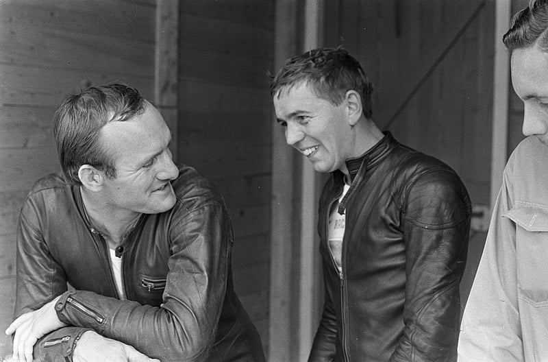 Hailwood (à gauche), aux côtés de Ralph Bryans durant un entraînement à Assen, année 1966. Photo : ANEFO