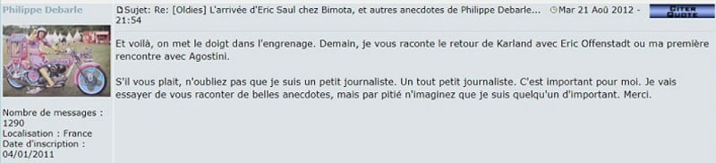J’ai une manie : Quand je téléphone, j’ai souvent un papier et crayon sous la main. Je note tout. Bref un jour Philippe m’appelle et me raconte comment il s’est passionné pour la moto. Ce texte est dans mon ordi depuis des années, je voulais qu’il m’en dise plus mais on s’est tant côtoyés à partir de notre rencontre à Imola qu’il ne voyait pas l’intérêt d’en rajouter.