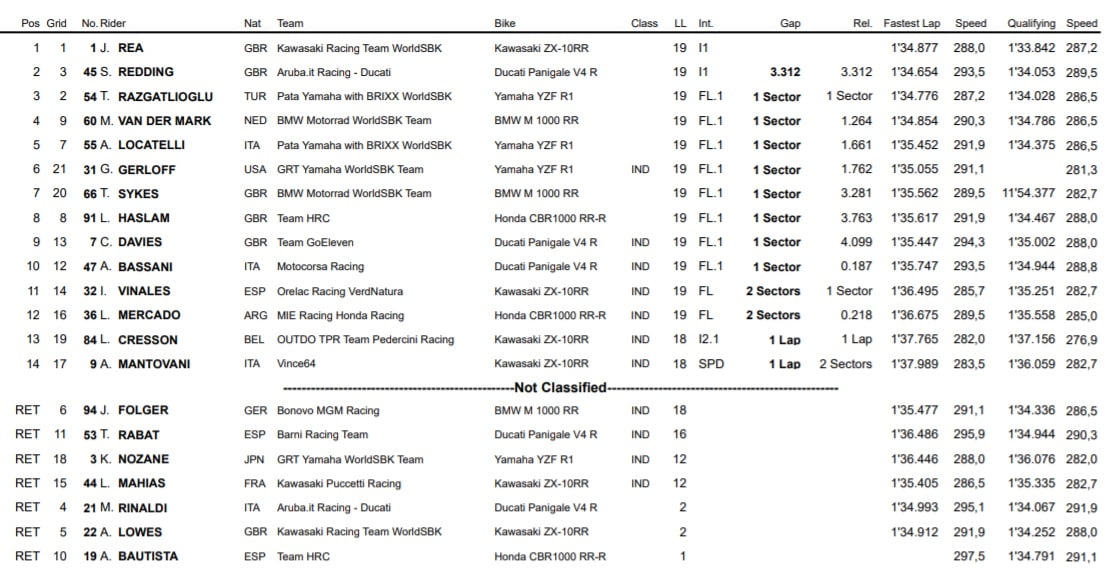 Ce ne fut pas le cas, et Rea a ainsi pu décrocher sa sixième victoire de la saison, reprenant du même coup la tête du championnat pour sept points d’avance sur Razgatlioglu. Ce nouveau succès constitue également un jalon important dans la relation entre le Britannique et Kawasaki, puisqu’il s’agit de sa 90e victoire pour le compte du constructeur japonais.